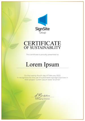 In recognition of clients that choose to utilise environmentally friendly and sustainable alternatives for their signage, we proudly present a custom certificate of sustainability, acknowledging the business and their chosen project to utilise our sustainable product range. Be the change you hope to see and inform your intended audience of the good you are doing with your branding and marketing campaign.